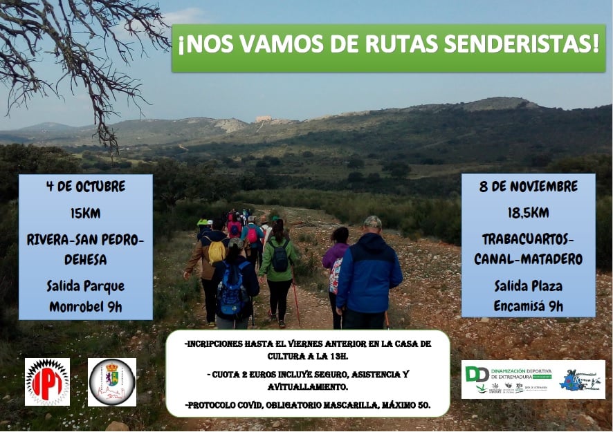 El Programa de Dinamización Deportiva ha informado que el día 4 de octubre va a tener lugar en Torrejoncillo la ruta senderista "RIVERA - SAN PEDRO - DEHESA". La cita que tomará salida a las 09:00 horas desde el parque Monrobel, contará con 15 kilómetros.