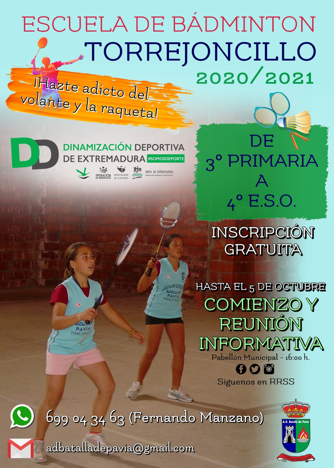 El programa de Dinamización Deportiva del Ayuntamiento de Torrejoncillo informa que volveremos a tener bádminton en Torrejoncillo activando la Escuela de Bádminton de la AD Batalla de Pavía que tantos éxitos trajo a la localidad, aunque con el objetivo principal de ofertar una actividad deportiva diferente y muy segura con grupos reducidos.