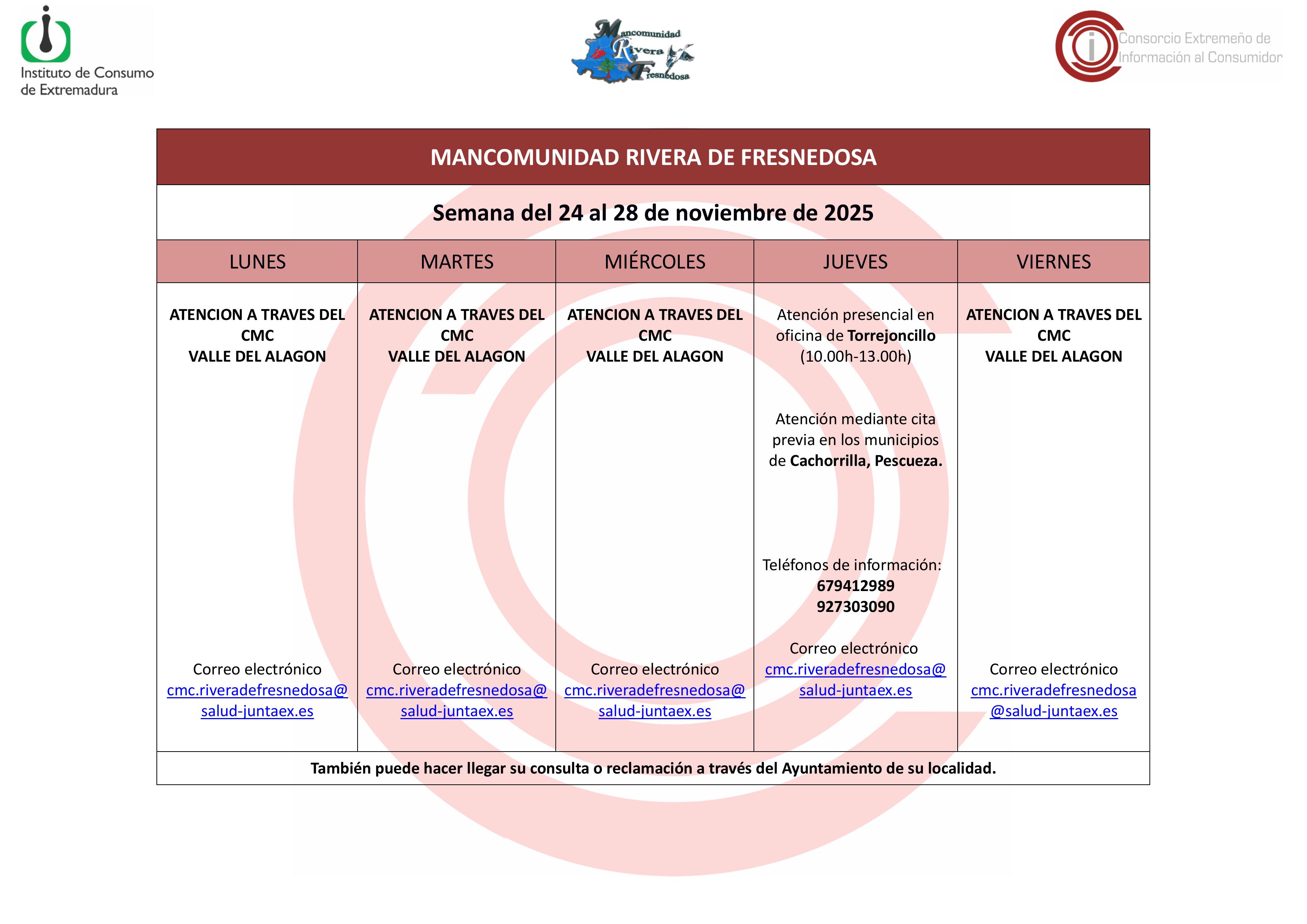 Oficina de Consumo – Semana del 24 al 28 de noviembre de 2025 24 noviembre 2025 Cuadro semanal de Atención Centro Mancomunado de Consumo Rivera de Fresnedosa, semana del 24 al 28 de noviembre de 2025.