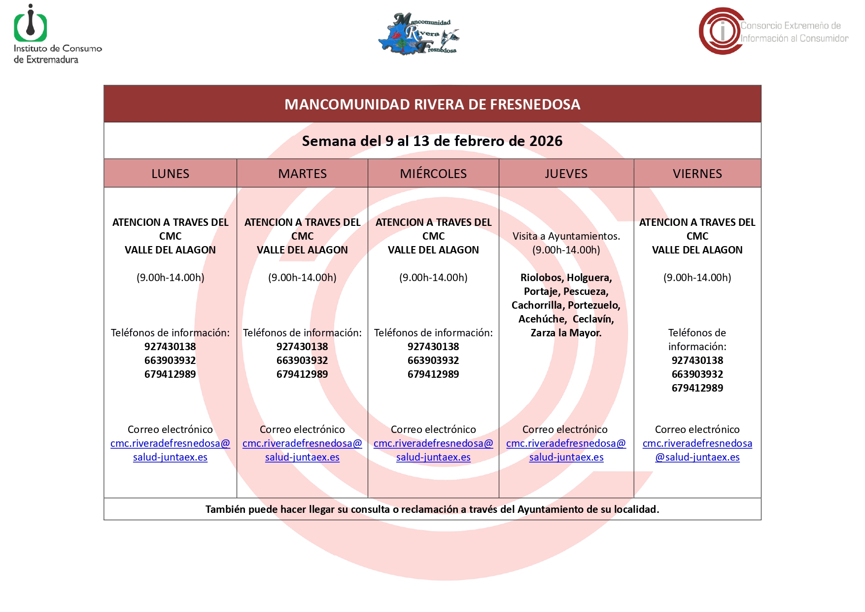 Cuadro semanal de Atención Centro Mancomunado de Consumo Rivera de Fresnedosa, semana del 9 al 13 de febrero de 2026.